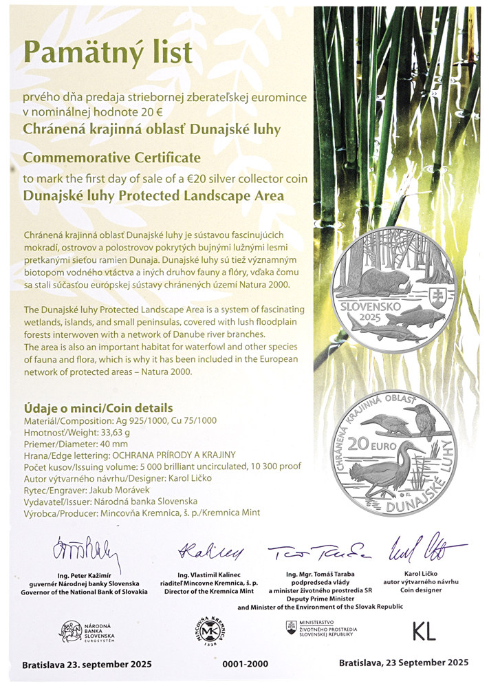Commemorative certificate to mark the first day of sale of the silver collector coin 20€ - Dunajské luhy Protected Landscape Area.