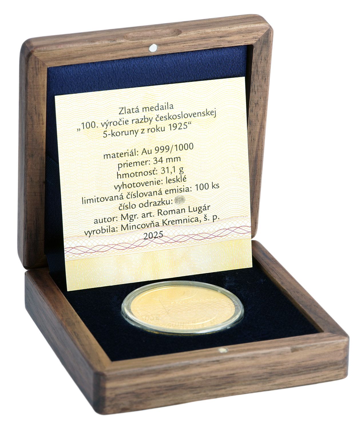 In 2025, it will be one hundred years since the minting of the five-crown coin, another denomination of the Czechoslovak interwar currency. The Kremnica Mint commemorates this milestone by minting gold, silver and brass medals. It began minting at the Kremnica Mint in 1925 and was intended to replace the original paper version of the currency. The five-crown design by Otto Gutfreund was used not only on nickel-plated crowns in 1925–1927, but also on silver five-crowns in 1937–1938. The five-crown began minting on May 26, 1925. Initially, even minor adjustments were necessary, but from June 1925, serial minting of the new coin continued.