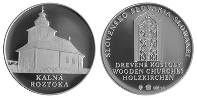 Strieborná medaila zo série medailí "Skvosty architektúry Slovenska – Drevené kostolíky" - KALNÁ ROZTOKA.